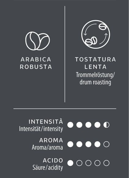 Elegantné espresso s plným telom nás vďaka jemnému procesu pomalého bubnového praženia zoznamuje s jedinečným chuťovým profilom typickým pre severné Taliansko. Vydajte sa s nami na pomyselný výlet do Milána. V chuti nájdete tóny čokolády a lieskového orieška. Káva je certifikovaná Rainforest Alliance a pochádza z plantáží z Južnej Ameriky a Ázie.